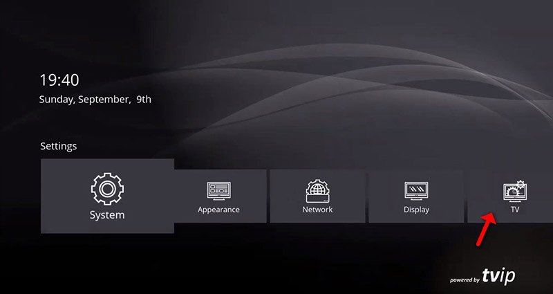 • Étape 1 : Une fois que vous avez démarré la TVIP Box et configuré les paramètres principaux tels que la langue et l’heure, rendez-vous dans le menu principal. Descendez pour voir l’option « Réglages » et cliquez sur « TV », comme indiqué dans l’image ci-dessous.
